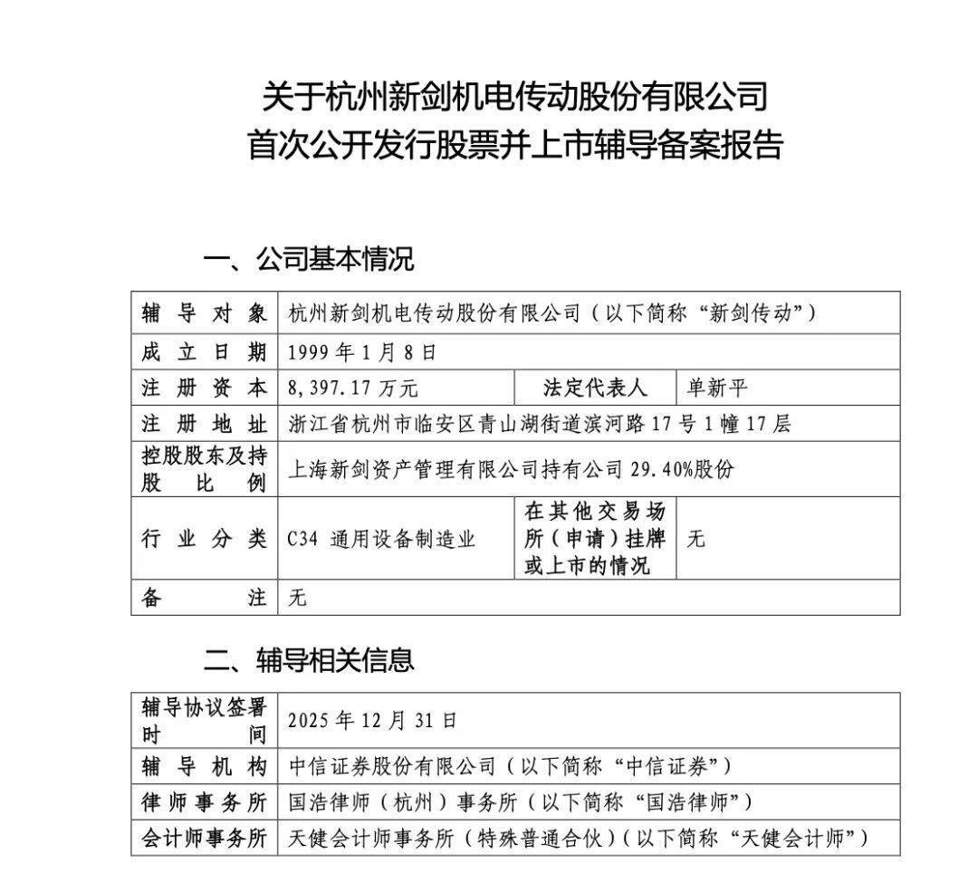 辅导备案报告显示,新剑传动行业分类为C34通用设备制造业。上海新剑资产管理有限公司持有新剑传动29.40%股份,为其控股股东。根据规划,辅导人员将于2026年4月至2026年5月,对新剑传动是否达到发行上市条件进行综合评估,协助新剑传动按相关规定准备首次公开发行股票并上市申请文件。