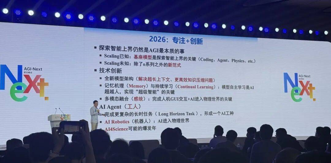 1月10日,凤凰网科技现场参与了由清华大学基础模型北京市重点实验室低调发起的一场名为AGI-Next的前沿峰会,与会人物除了前述提及的三人,还包括Qwen技术负责人林俊旸。他们要探讨的,正是迈向AGI下一阶段的关键路径。