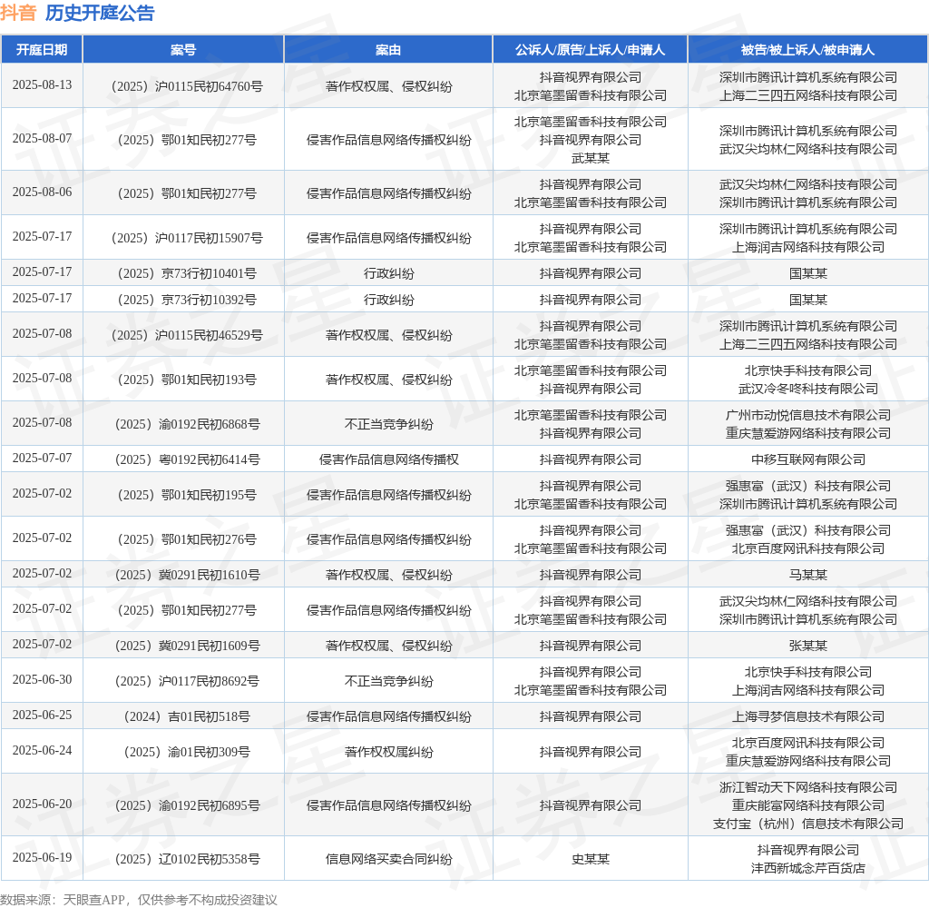 案号:(2025)渝0192民初6895号审理法院:重庆两江新区人民法院(重庆自由贸易试验区人民法院)案由:侵害作品信息网络传播权纠纷当事人信息: 原告/上诉人:抖音视界有限公司 被告/被上诉人:浙江智动天下网络科技有限公司、重庆能富网络科技有限公司、支付宝(杭州)信息技术有限公司开庭日期:2025年6月20日根据统计,近一年内以抖音视界有限公司为当事人的历史开庭公告有86则,其中案由为“侵害作品信息网络传播权纠纷”的公告以37则居首,其次为“著作权权属、侵权纠纷”有27则,“侵害商标权纠纷”有6则。历史开庭公告(前20条)如下: